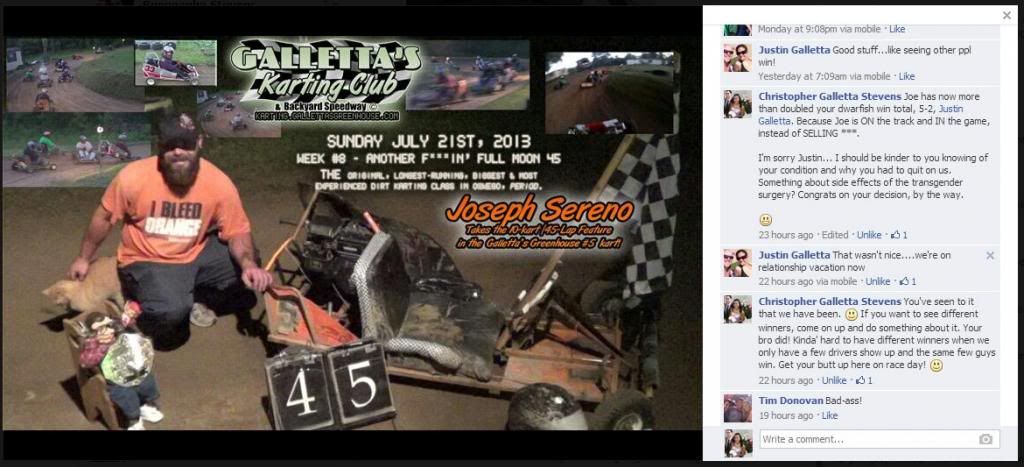 Keep in mind that Joe’s brother Justin Galletta – who joined at the same time and they were on equal credentials through their 1st two years – quit while into his 2nd season at a measly 2 feature wins, right before he quit as the starting middle linebacker of the Syracuse Shock football team! Joe has now more than doubled the win total of his quitter brother. What an atrocious blot on the sports career of one Justin Galletta! In an abysmal expose in absolute cowardice, Justin dared comment on Joe’s victory pic on the social media giant website known as Facebook!: