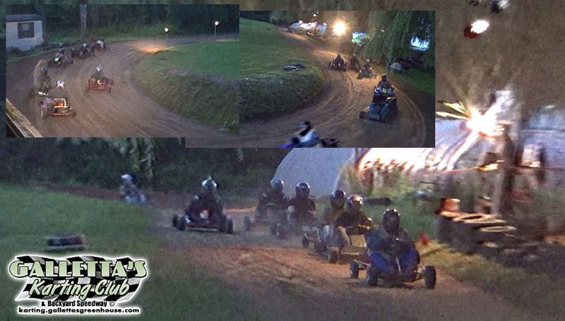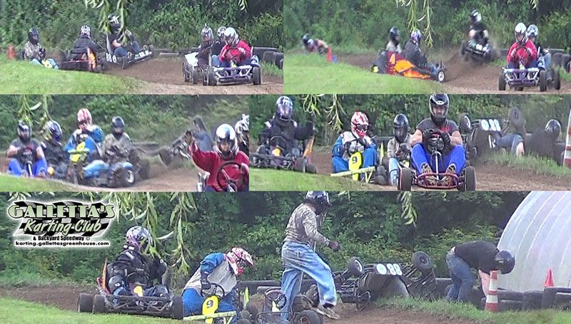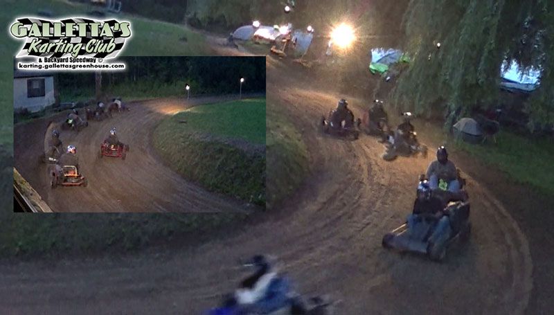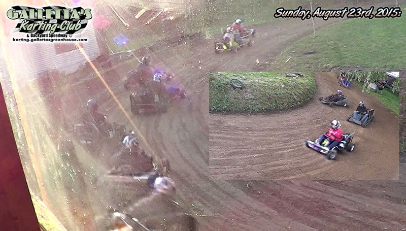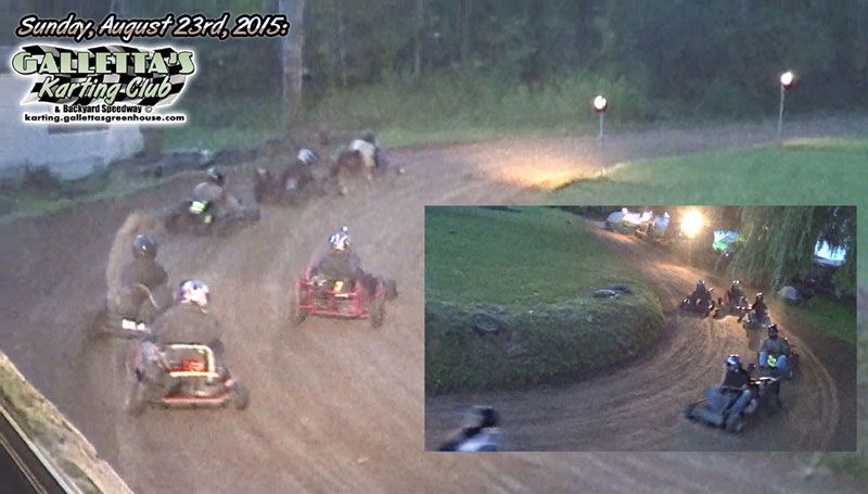 SATURDAY, AUGUST 22nd, 2015, OSWEGO, NY – This weekend will be a double-header at Galletta’s! A special make-up/rookie/powderpuff makeup race was held on Saturday, which went to Kevin Galletta (in the Galletta Bros. #28). This race was originally scheduled a few weeks in advance for Kristina McCann and friends but wound up also evolving into a race for any racers who needed a makeup race (including a few rookies learning the quickest line and the karts), which we usually hold BEFORE the regular races, but we got them out of the way a day early. Also, a rarely-used for-sale kart was sold to a new rookie race team (their 2nd now), which makes two karts back on track for regular racing again. The racing continues Sunday for the regular points race will be held Sunday, August 23rd, 2015 at roughly 6pm. It went down as follows…