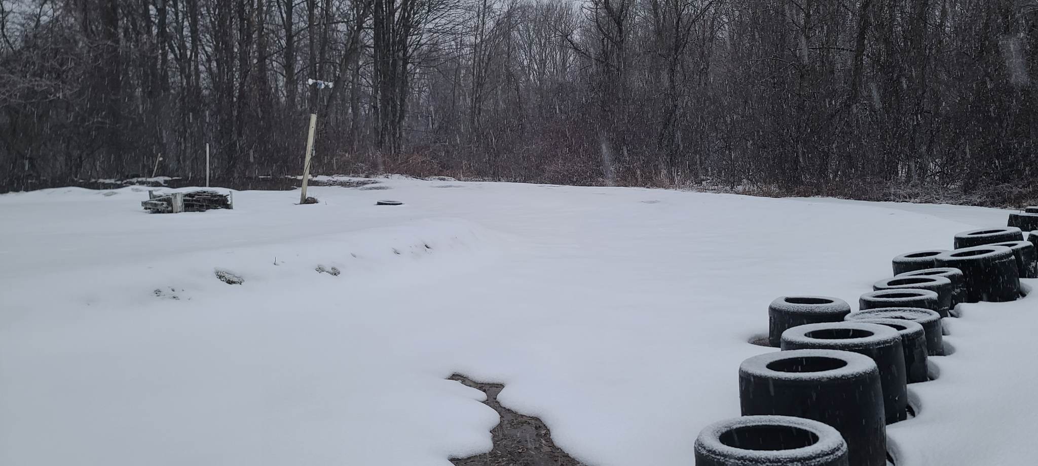 Galletta's Backyard Go-Kart Speedway is a free-to-race-on and free-to-watch 0.133887 mile dirt oval with 20-degree banked turns . It is located behind Galletta's Greenhouse in Oswego, NY, and can be seen from outer space! The single-wheel-drive gasoline-fueled flathead motor karts take the track between 15-17 seconds per lap which averages over 30 mph (approximately 45-50 mph top speed in the straights). Our speeds are comparable to alcohol/methanol-fueled karts that cost 8 times as much because we use mostly homemade or rebuilt go-karts and gas on a large track; leading to more karts, more competition, and more fun. Our class is usually the largest and most competitive in the area. Thanks to Google Earth for this Spring 2006 photo. Our karting club's home track is located in back of: